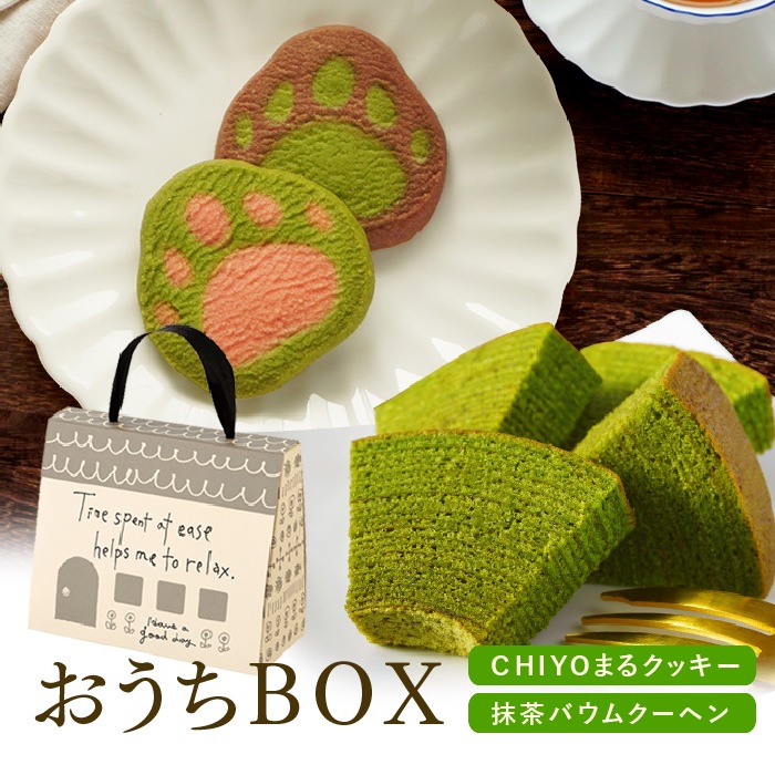 | 内容量 | 5箱(1箱あたり抹茶バウムクーヘン1袋(4切れ)、CHIYOまるクッキー2枚(抹茶&ココア1枚、抹茶&いちご1枚) |